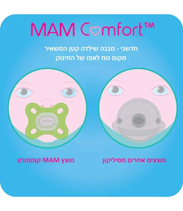 מוצץ מאמ קומפורט MAM COMFORT עשוי יחידה אחת שלמה של סיליקון. קטן במיווחד ובעל משקל קל, אידיאלי לתינוק שרק נולד (ניו בורן). 100% בטיחות ונוחות. מגיע באריזת נשיאה המתאימה גם לסטריליזציה עצמית במיקרוגל. מגיע בצבע כחול לבנים וורוד לבנות.