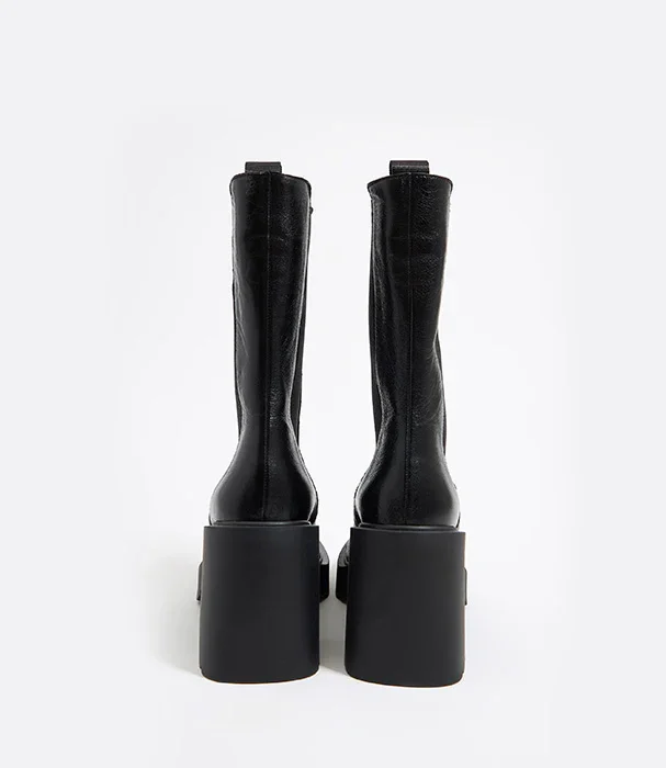 בימבה מגפי עקב לנשים, בצבע שחור עשויות מעור איכותי במראה מעט מטאלי, בגזרה בינונית במראה צ'אנקי עם סוליה עבה בשילוב עקב בגובה 9 ס"מ.