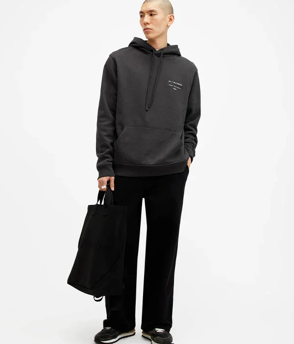 | קפוצ'ון REDACT OTH HOODY לגברים של מותג האופנה הלונדוני ALL SAINTS, קפוצ'ון עם כובע בצבע שחור, הדפס הלוגו המותג בחזה ובגב. |