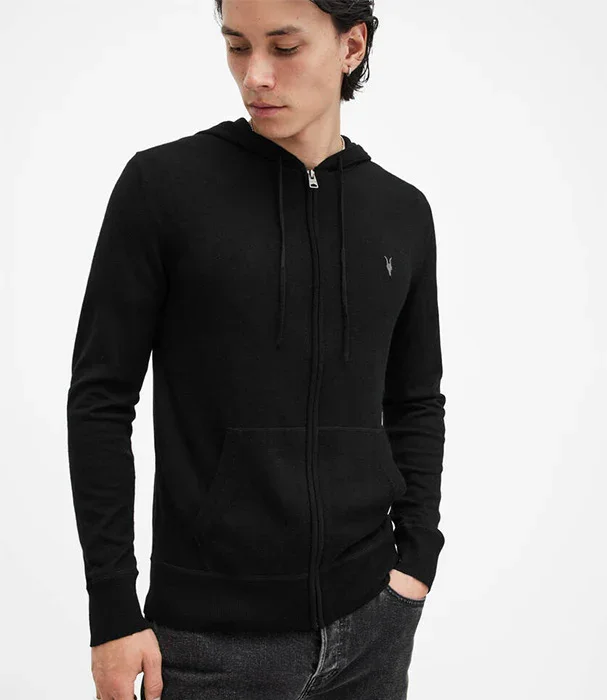 אול סיינטס קפוצ'ון MODE MERINO ZIP HOOD לגברים, קפוצ'ון בצבע שחור עם שרוולים ארוכים בשילוב כובע ולוגו המותג בקטן מקדימה, בסגירת רוכסן קדמי, עשוי מצמר איכותי במיוחד.