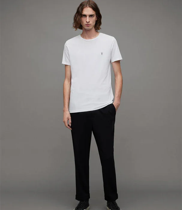 | חולצת טי-שירט לוגו רקום לגברים של מותג האופנה הלונדוני ALL SAINTS, חולצת טי-שירט קלאסית עם שרוול קצר בצבע לבן, לוגו רקום בחזית וצווארון עגול. |