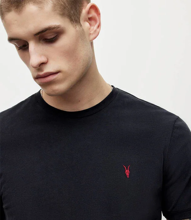 | טי-שירט BRACE CONTRAST SS CREW לגברים של מותג האופנה הלונדוני ALL SAINTS, בצבע שחור עם שרוולים קצרים וצווארון עגול, עשויה מכותנה נעימה ואיכותית במיוחד, עם לוגו המותג בקטן באדום בחלק הקדמי של החולצה. |