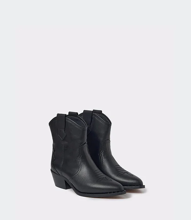 בראוני מגפי בוקרים לנשים, בצבע שחור מעור בגזרת מגפי בוקרים נמוכה בשילוב לולאות בסיומת ועקב נמוך.