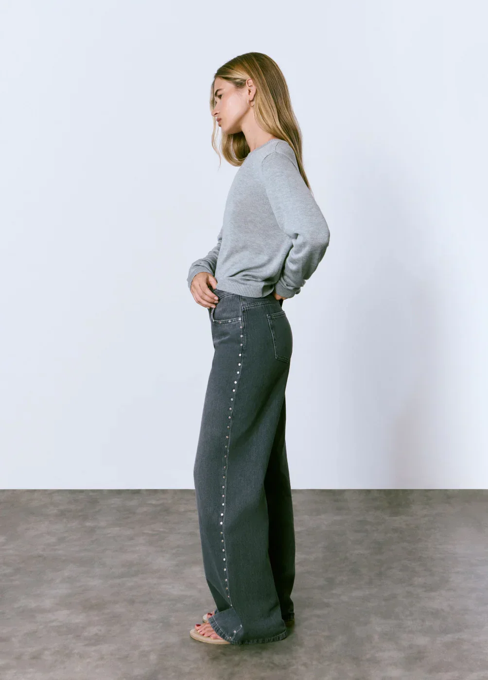 בראוני ג'ינס בגזרה ישרה לנשים של מותג האופנה הספרדי בראוני, בצבע אפור כהה עם כיסים קדמיים ואחוריים, בשילוב ניטים כסופים בצדדים ומקום לחגורה, בגזרה ישרה ומשוחררת בסגירת רוכסן וכפתור.