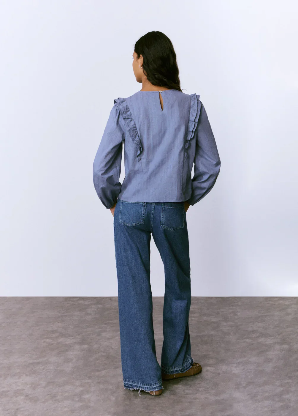 בראוני חולצה ארוכה לנשים של מותג האופנה הספרדי בראוני, בצבע כחול מבד בטקסטורה, עם שרוולים ארוכים וצווארון עגול, בשילוב מלמלה בחלק הקדמי.